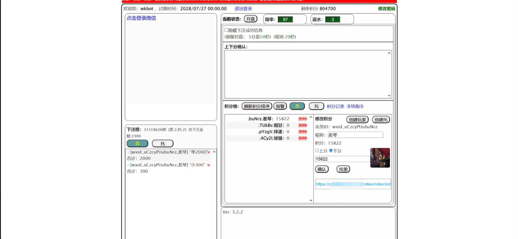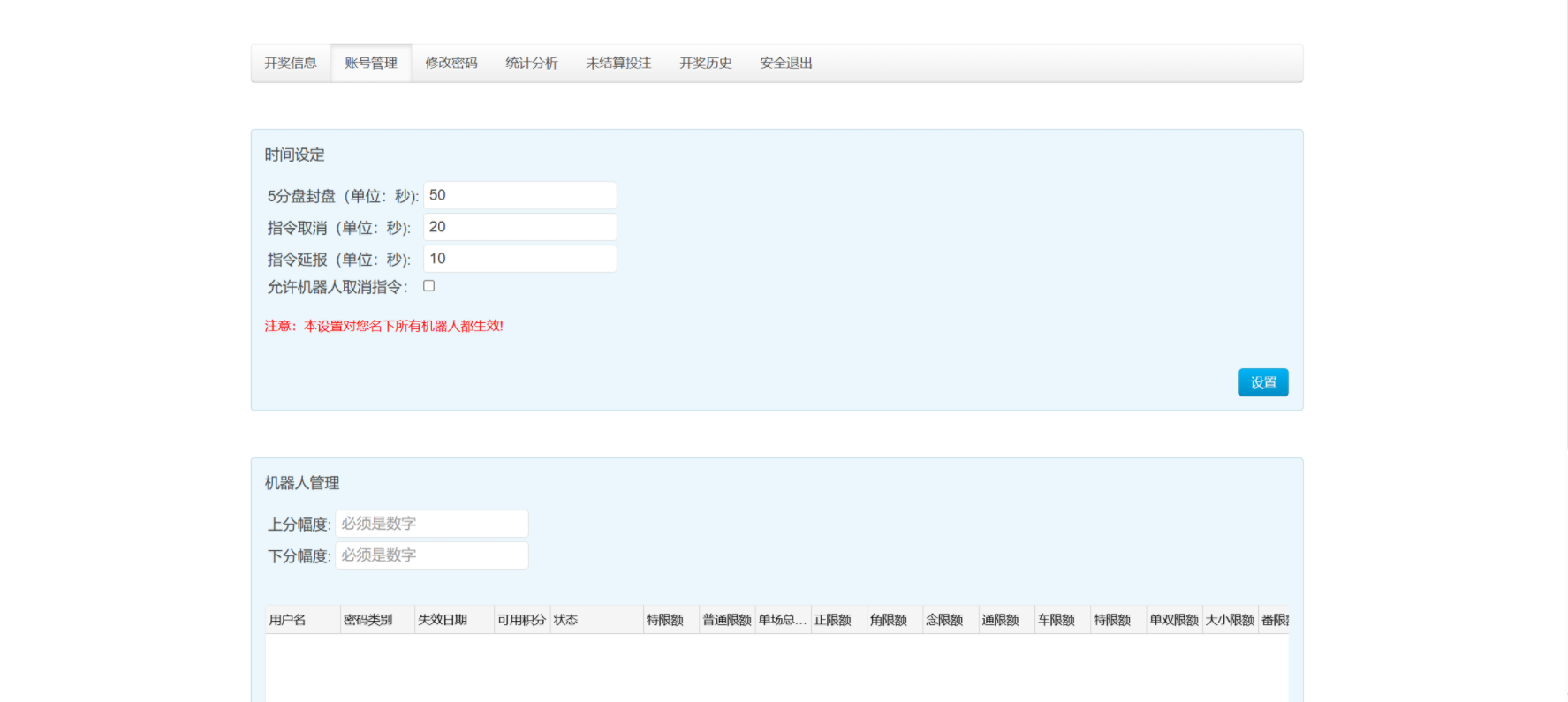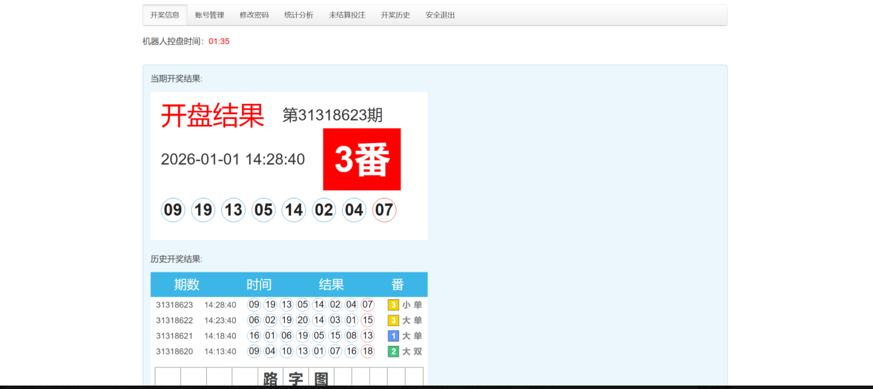 开奖对接的是168,可以正常采集开奖结算,测试除了功能单一其他也还行,总后台没有开下级代理账户的地方,前端需要在机器人后台创建玩家后复制对应链接才可以进入