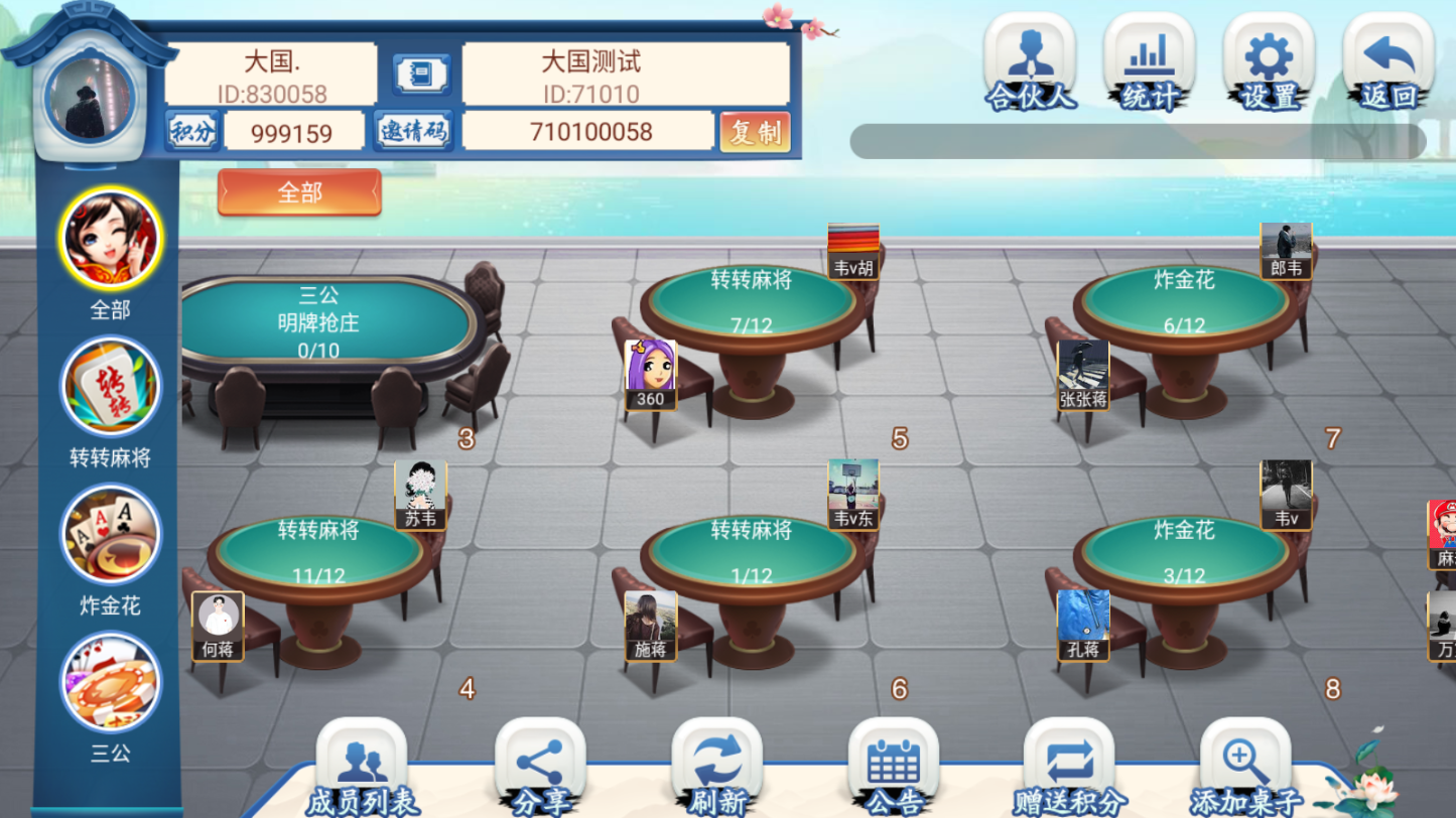 麻将:红中麻将,转转麻将,血站麻将,血流麻将,抓鸡麻将,平阳麻将,灵溪麻将,三门麻将,柳州麻将,点炮麻将,温州麻将,贵富麻将,三阿磨,义乌麻将,建德麻将,跑胡子:长沙跑胡子,衡阳十卡胡,柳州跑胡子,十三水:多人十三水,温州十三水,牛牛:明牌抢庄,固定庄家,自由抢庄,牛牛上庄,通比牛牛,扑克:斗地主,跑得快,炸金花,三公